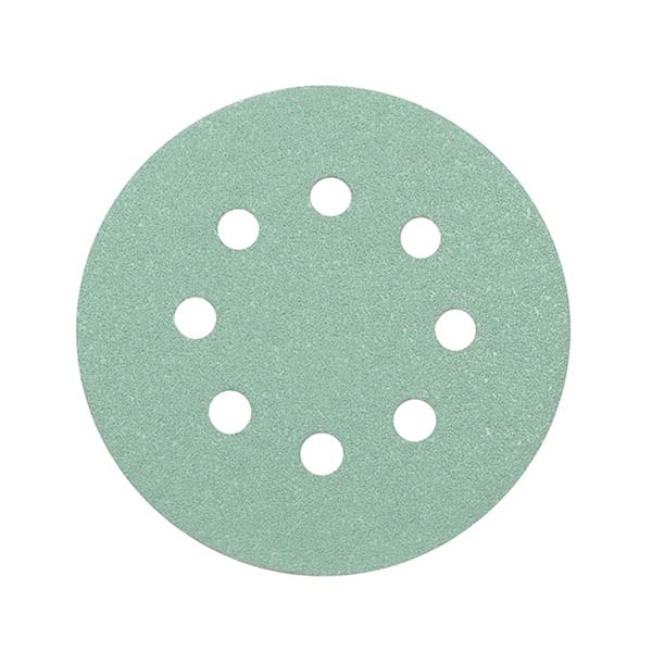 Autoadherente. . Composición:. - Soporte: Papel semilátex y unión de resina.. - Grano: Óxido de aluminio.. - Revestimiento: Abierto.. Acabado: Sobre espuma. Juego 5 unidades. 8 agujeros.. Reduce el embozamiento. ø 125 mm. Grano 40. 5 unid.