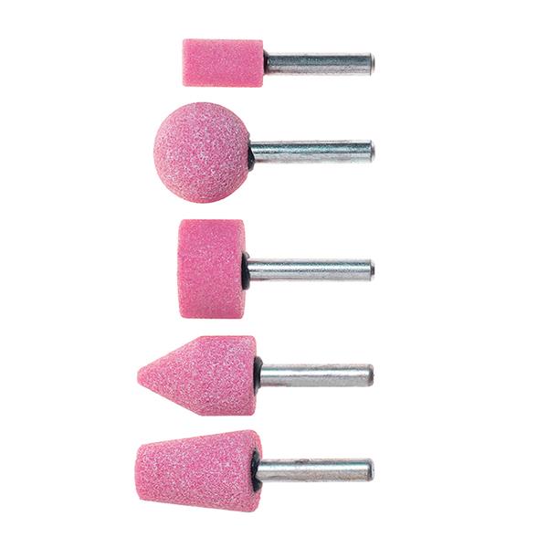 Juego 5 unidades surtidas. Para metal, vidrio, cerámica y plástico. Corindón rosa. Vástago ø 6 mm.