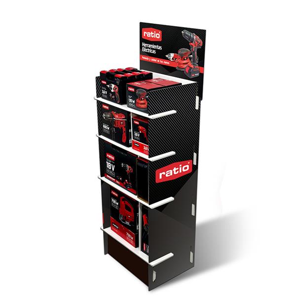 El expositor incluye: 7994X428 TALADRO ATORNILLADOR A BATERIA R-AT36G 6 Unid: 7994X430 AMOLADORA ANGULAR RAM 720 4 Unid. 7994X431 LIJADORA DELTA R-LD135 RATIO 4 Unid. 7994X457 ATORNILLADOR 3,6V R-AT36S 8 Unid. 7994X467 TALADRO 650W RATIO R-T650S 4 Unid. 7994X468 SIERRA CALADORA 500W RATIO R-SC500S 4 Unid. 7994X469 ATORNILLADOR PERCUTOR 18V RATIO R-AT20S 4 Unid.
