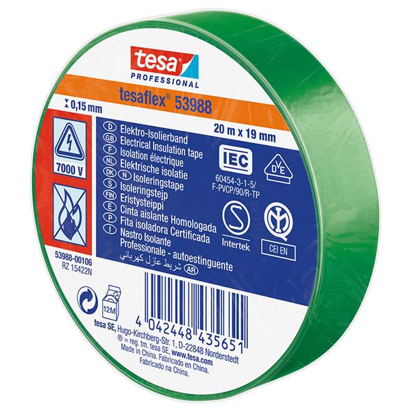 PVC blando. Soporte grueso, alta flexibilidad y rendimiento bueno en acero y a bajas temperaturas. Certificaciones VOC, REACH, y RoHS. Certificado según norma IEC 60454-3-1, VDE, IMQ, SEMKO. Tensión de ruptura dieléctrica Voltaje de 7.000 Volt. Resis 20 m x 19 mm. Verde.