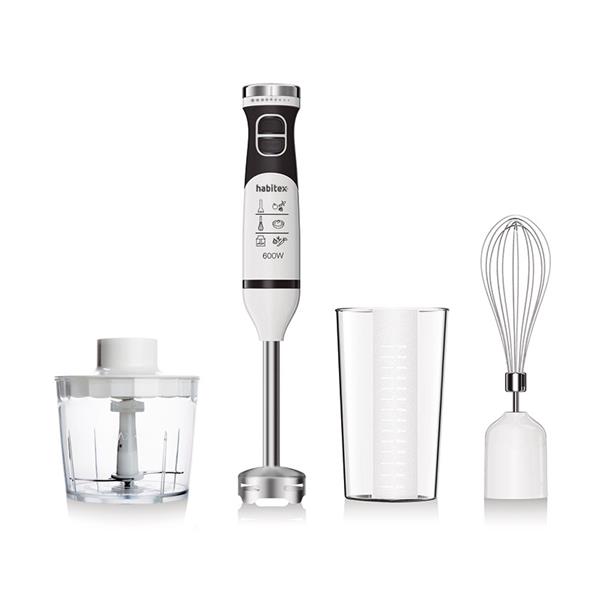 2 velocidades + regulador velocidad continua. Varilla acero inox. desmontable. Vaso medidor 700 ml con tapa. Cuchillas acero inox. Incluye accesorio batidor y picadora 500 ml base antideslizante. Accesorios aptos lavavajillas. Soporte pared. Potencia: 600 W.