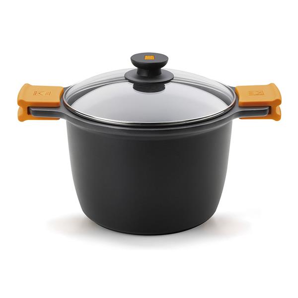 Aluminio fundido. 6 mm de espesor de base. Revestimiento tricapa antiadherente Teflón Platinum Plus, 100% libre de PFOA. Asas de silicona termoresistentes y desmontables. Cacerolas con tapa. Aptas para todo tipo de cocinas. Olla alta 24 cm.