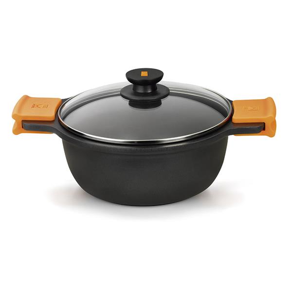 Aluminio fundido. 6 mm de espesor de base. Revestimiento tricapa antiadherente Teflón Platinum Plus, 100% libre de PFOA. Asas de silicona termoresistentes y desmontables. Cacerolas con tapa. Aptas para todo tipo de cocinas. Cacerola alta 24 cm.