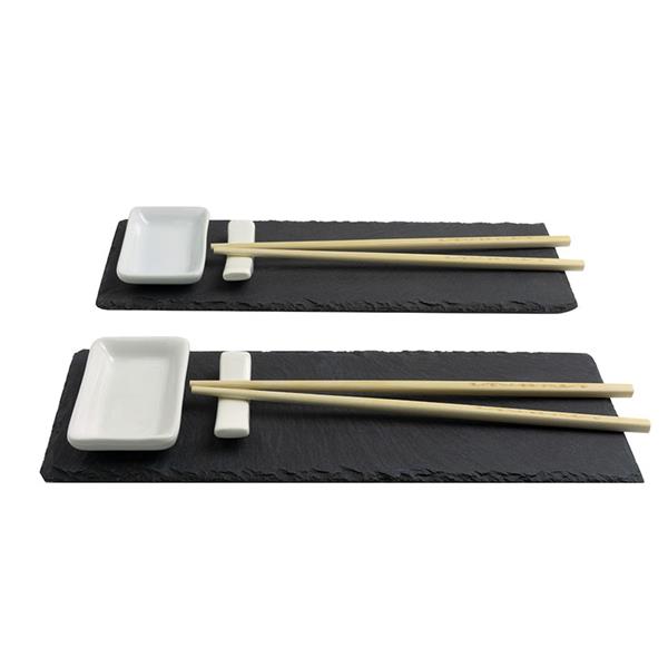 Juego 2 personas. 4 palillos de bamb?, 2 soportes cer?micos para palillos, 2 salseras cer?micas aptas para lavavajillas y microondas y 2 placas rectangulares de pizarra. Juego 10 piezas.