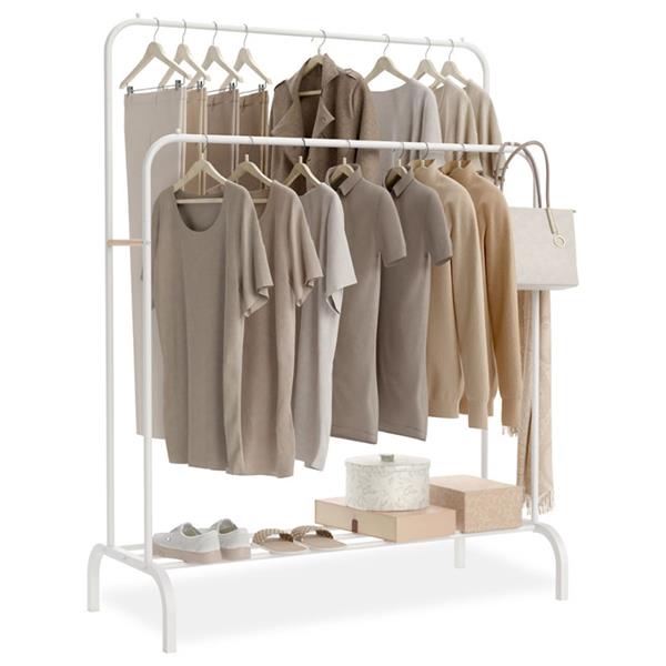 2 alturas: 131 y 101,5 cm. Ancho 92,5 cm. nivel 1 y 98,5 cm. nivel 2. Incluye zapatero: estante adicional en la parte inferior de 109,5 cm. Multifuncional: perchero, zapatero y tendedero de interior. Base antirayaduras y topes antideslizantes: incluye 4 almohadillas de protección. Diseño compacto y portátil. Fácil montaje. Soporta hasta 30 kg. Color blanco. 115x50x150 cm.