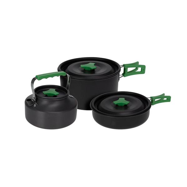 Juego 3 piezas especial camping. Aluminio anodizado con mangos acero inoxidable. Cacerola con tapa 178x90 mm. + Sart?n 180x43 mm. + Hervidor con tapa 151x75 mm. Mango plegable color verde. Juego 3 piezas.