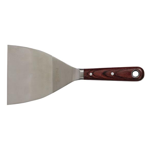 Hoja en acero inoxidable flexible y pasante hasta el mango. Mango madera de 105 mm largo. Espesor hoja: 1,5 ~ 0,5 mm. 100 mm.