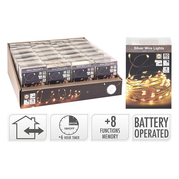 IP44. Funciona con 3 pilas AA (LR06) no incluidas. Programador 8 funciones. 80 Led. 4 m. Blanco cálido.