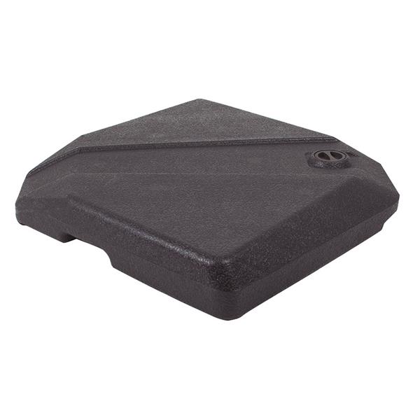 Base rellenable color gris antracita. Fabricada en resina para llenar con agua/arena. Peso cuando est? lleno agua: 16 Kg. Peso lleno arena: 25 kg. Alta resistencia a los rayos UV. 49x49x8,7 cm. 25 kg. 4 unid.